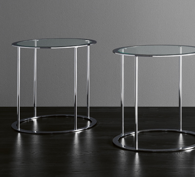 Ein klassischer Tisch mit quadratischer Form in einer verchromten Ausführung oder aus schwarzem Metall, mit einer Platte und Unterseite aus Glas.